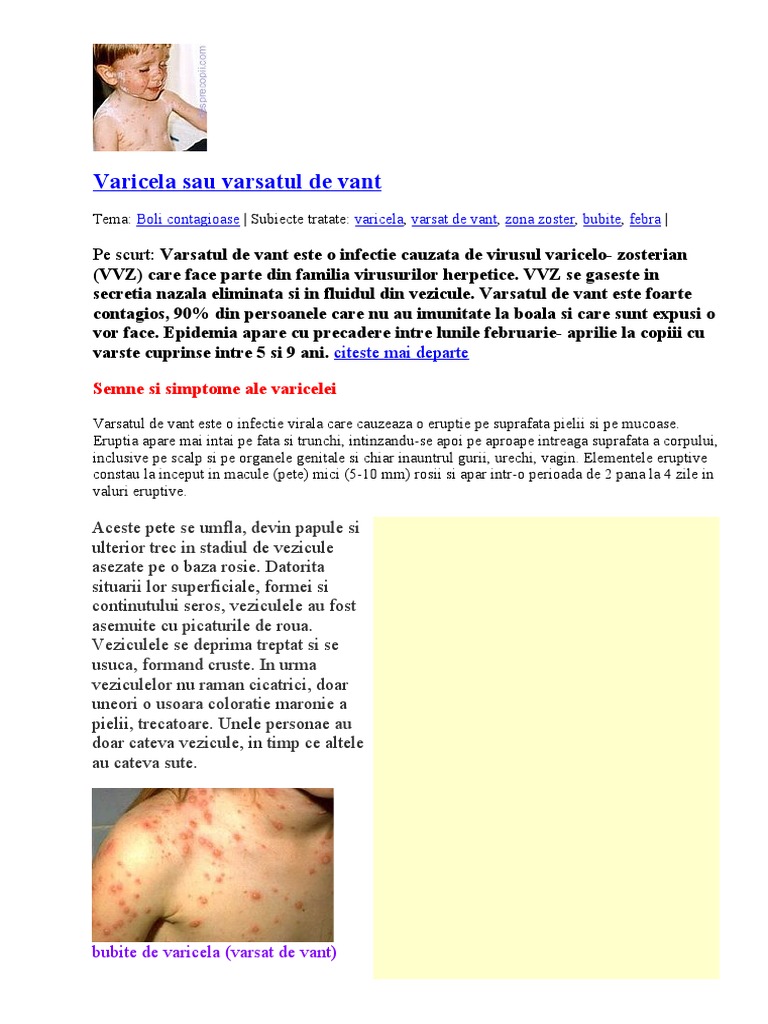 vizitati articolul complet aici : https://www.formaremedicala.ro/educatie-pacienti/varicela/ Denumirea nu vine de la herpesul care apare in zona buzelor, pe care il cunoastem cu totii, ci de la agentul care provoaca boala, virusul varicelo zosterian care face parte din familia virusurilor herpetice. Majoritatea pacientilor cu aceasta infectie virala vor avea urmatoarele simptome sau manifestari ale zonei zoster: Zona zoster este o boală mai comună la persoanele adulte și la cele cu sistemul imunitar slăbit de stres, răni.